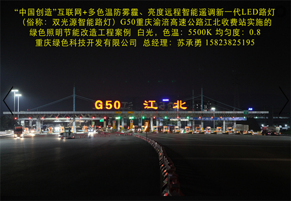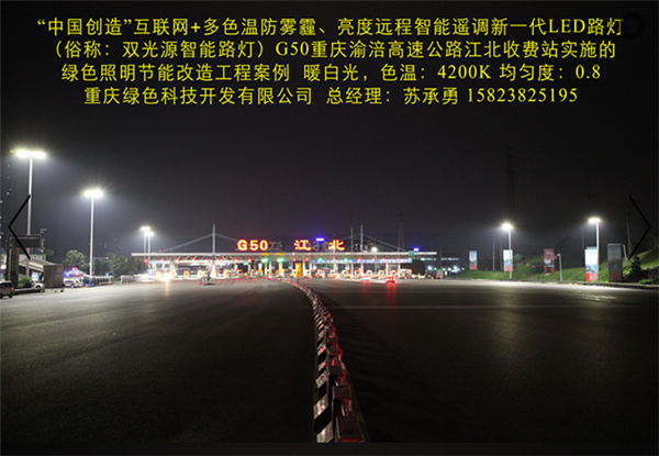 Division I (national high-tech enterprises) in Chongqing G50 Chongqing Fuling expressway toll station Fusheng implementation of the "Chinese creation" Internet plus color temperature, brightness and anti fog haze remote intelligent remote control of a new generation of LED Street (commonly known as: Chameleon intelligent street lamp) green lighting project. In the highway lighting in the use of the Chinese creation "Internet plus color temperature, brightness and anti fog haze remote intelligent remote control of a new generation of LED street lamp and the intelligent control system, better stability, higher reliability, color, light response speed is more agile. It has four major characteristics: the technology has four major characteristics: (a) by PM2.5 sensor, temperature sensor, ultrasonic sensor, radar remote camera automatic acquisition of environmental protection, meteorology, transportation, security and other information, analyze the information sharing and data services through the cloud platform. (two) in different climate and season, according to the change of climate and environmental sensory needs people, through the temperature sensor, humidity sensor, PM2.5 sensor, intelligent remote control to achieve a variety of lighting lamps, color temperature, improve the human sensory comfort. The remote intelligent control system automatically collects the temperature, rain, fog and haze data of the lighting environment, and intelligently regulates the light color temperature to be the most comfortable and safest lighting value (3000K-5700K). (three) the brightness of light can be remotely intelligently adjusted. In different time periods, different light intensity, different traffic flow, etc., through the photosensitive sensors, ultrasonic sensors, radar sensors and other intelligent control, to achieve a variety of brightness lighting mode. In different periods of light adjustment for a variety of lighting mode, including "daytime mode", "night mode", "summer mode" and "winter mode" and "anti haze mode", which greatly improve the saving rate, and effectively solve the tunnel lighting for saving electricity is widely adopted for closed control loop or interval lights cause lighting the dark zone, the presence of traffic safety problems. (four) the important parameters such as luminance uniformity, illuminance uniformity and energy saving rate are all better than the national standard of LED street lamps. A new generation of multi-color temperature LED intelligent street lamp, one can be used when more than one ordinary monochromatic temperature LED street lamp, the cost performance is higher, can improve the light efficiency of 10%, and prolong the service life of lamps more than doubled. Intelligent color matching and dimming lighting are more comfortable, safe and energy-saving. This product is our use of a number of independent patent technology (patent number: 201320842388, 201320028126, 2015204938054) R & D, manufacturing "China creation" Internet plus color temperature anti haze brightness remote adjustment of a new generation of LED intelligent lighting products, the science and technology novelty has won the "novelty search report" (No: J201508016831). That is the "China creation", the one and only LED lamps advanced technology application of intelligent manufacturing technology; it has been included in the "2015 annual scientific and technological achievements into the project" Chongqing City SME (small enterprises in Yuzhong 2015 No. 188), approved the establishment of Chongqing City Engineering Research Center [LED Intelligent Control Technology Chongqing 2015 technology development and reform No. 1865]; has been included in the "2016 Chongqing Internet plus pilot demonstration project", "2016 year Chongqing city technology innovation guidance project". Has obtained "Chongqing hi tech products", "Chongqing municipal industry new technology certification" certificate.