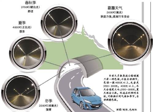 “在不同氣溫和季節(jié),照明系統(tǒng)可根據(jù)隧道外光線自動(dòng)調(diào)整色溫,以提高駕乘舒適度?!敝貞c綠色開發(fā)有限公司的法人代表蘇承勇介紹(具體情況如右圖)。這也降低了隧道內(nèi)事故發(fā)生率,且還節(jié)能。該技術(shù)是重慶綠色開發(fā)有限公司與重慶房地產(chǎn)職業(yè)學(xué)院聯(lián)合研發(fā)的,具有自主知識(shí)產(chǎn)權(quán),填補(bǔ)了我國(guó)高速公路隧道照明領(lǐng)域的空白。