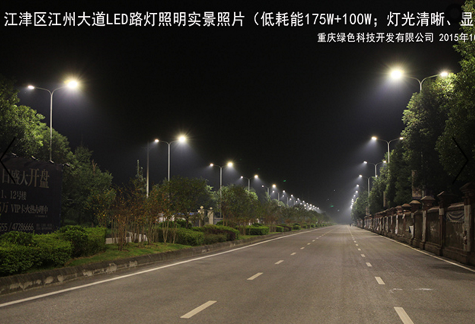 重慶城建經(jīng)濟(集團)重慶綠色科技開發(fā)(集團)有限公司對江津區(qū)江州大道實施的175W+100W“十惠牌”LED智能路燈替換440W+275W鈉燈節(jié)能改造項目,主要具有路面燈光清晰度高(顯指70)、均勻度好、光效高等特點,該燈具性能指標(biāo)均領(lǐng)先全國同類產(chǎn)品,若配用我司自主研發(fā)的專利技術(shù)“互聯(lián)網(wǎng)+多色溫LED路燈、隧道燈六遙(多色溫、遙調(diào)、遙測、遙控、遙視、遙信)控制系統(tǒng)”(專利號:2015204938054)可實現(xiàn)智能控制。本產(chǎn)品是我司利用多項自主專利技術(shù)(專利號:201320842388、201320028126、2015204938054)研發(fā)、制造的LED智能路燈產(chǎn)品,并已獲得“重慶市高新技術(shù)產(chǎn)品”、“重慶市市政行業(yè)新技術(shù)認(rèn)證”。案例實景照片展示如下(2015年10月16日):