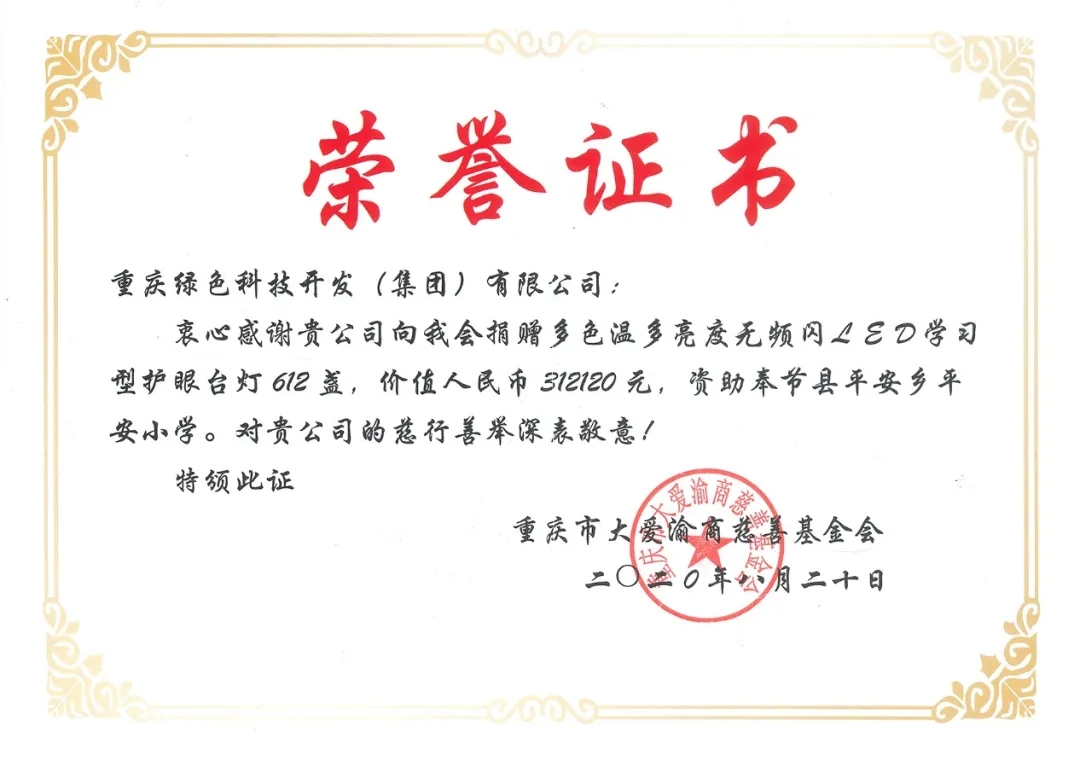 2020年8月5日,重慶綠色科技開發(fā)(集團)有限公司支持國家級重點貧困縣精準扶貧工作,通過重慶市大愛渝商慈善基金會,向奉節(jié)縣平安鄉(xiāng)平安小學捐贈多色溫多亮度無頻閃LED學習型護眼臺燈612盞、太陽能智慧燈桿4套,總價值36.2萬元的愛心物資,助力脫貧攻堅。