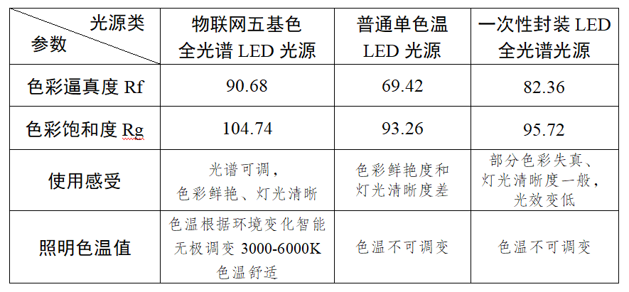 圖2 物聯(lián)網(wǎng)五基色全光譜多色溫LED光源與普通單色溫LED光源、一次性封裝LED全光譜光源參數(shù)對(duì)比